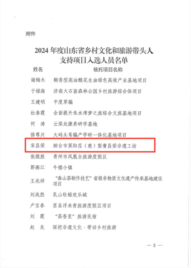 近日,山東省文化和旅游廳公布“2024年度山東省鄉(xiāng)村文化和旅游帶頭人支持項目入選人員名單”,我市推薦的萊陽市昌榮食品有限公司董事長宋昌榮入選為2024年度山東省鄉(xiāng)村文化和旅游帶頭人。